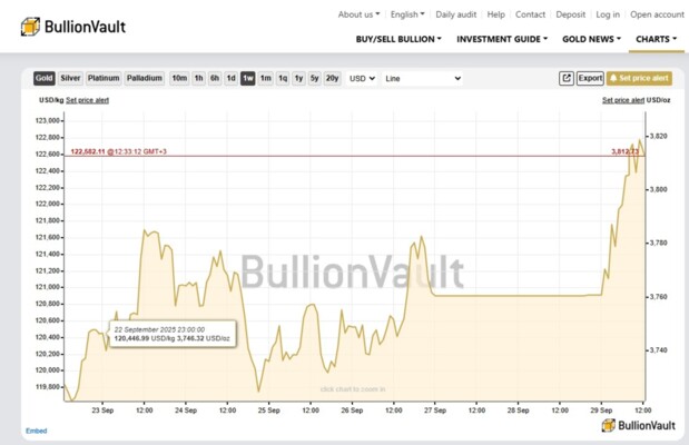 BullionVault، حيث أنهى المعدن النفيس تداولاته عند 122,582.11 دولارًا للكيلوغرام، أي ما يعادل 3,812.73 دولارًا للأونصة، وهو أعلى مستوى خلال الأسبوع.