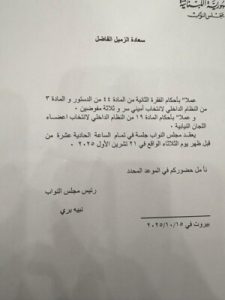 دعا رئيس مجلس النواب نبيه بري، الى عقد جلسة عامة لانتخاب أمينَي سر و3 مفوضين، وإنتخاب أعضاء اللجان النيابية في تمام الساعة 11 من قبل يوم الثلاثاء المقبل، وذلك عملاً بأحكام الفقرة 2 من المادة 44 من الدستور والمادة 3 من النظام الداخلي لانتخاب أميني سر و 3 مفوضين، وعملا بأحكام المادة 19 من النظام الداخلي لانتخاب أعضاء اللجان النيابية.
