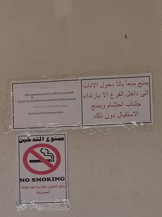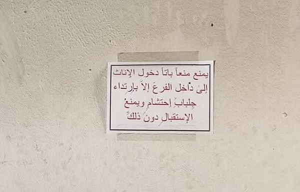 ملصقات على الجدران الداخلية والخارجية تؤكد شرط ارتداء الجلباب.