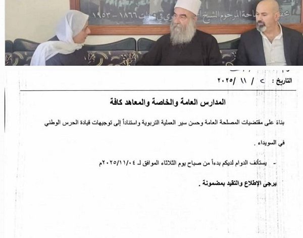 أعلنت مديرية التربية في محافظة السويداء، اليوم الأحد، استئناف العملية التعليمية والدوام في المدارس اعتباراً من يوم الثلاثاء القادم الموافق ٤/١١/٢٠٢٥، وذلك استناداً إلى كتاب رسمي ورد من قيادة الحرس الوطني.
