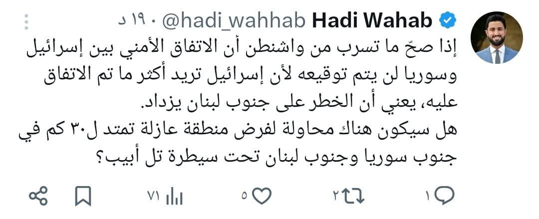 هذه التطورات المتزامنة تعزز الفرضية التي أشارت إليها تغريدة د. وهاب، وهي أن تعثر مسار التفاوض في سوريا قد يدفع إسرائيل إلى تعزيز ضغطها لتحقيق مكاسب أمنية مماثلة في لبنان، مما يزيد من حدة التوتر والخطر في الجنوب اللبناني”.