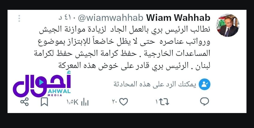 “نطالب الرئيس بري بالعمل الجاد لزيادة موازنة الجيش ورواتب عناصره حتى لا يظل خاضعاً للابتزاز بموضوع المساعدات الخارجية. حفظ كرامة الجيش حفظ لكرامة لبنان. الرئيس بري قادر على خوض هذه المعركة”.