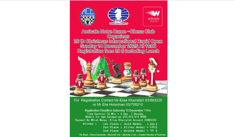 ينظم نادي الشطرنج في رابطة قدامى مدرسة نوتردام فرير فرن الشباك دورة الميلاد الدولية المفتوحة الـ26 في الشطرنج السريع، بدءا من الحادية عشرة من قبل ظهر الأحد 14 كانون الأول المقبل، بإشراف اتحاد اللعبة. وقد خصصت لها جوائز نقدية وعينية.