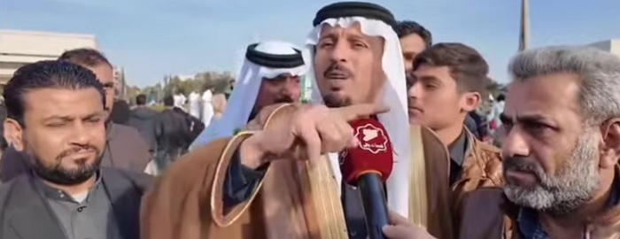 وفي منصة تحريضية جديدة، أقدم شخص يدعي زعامة قبيلة العقيدات على تهديد مباشر وصريح في ساحة الامويين بدمشق بمسيرات التأييد التي دعى لها الجولاني وقال :