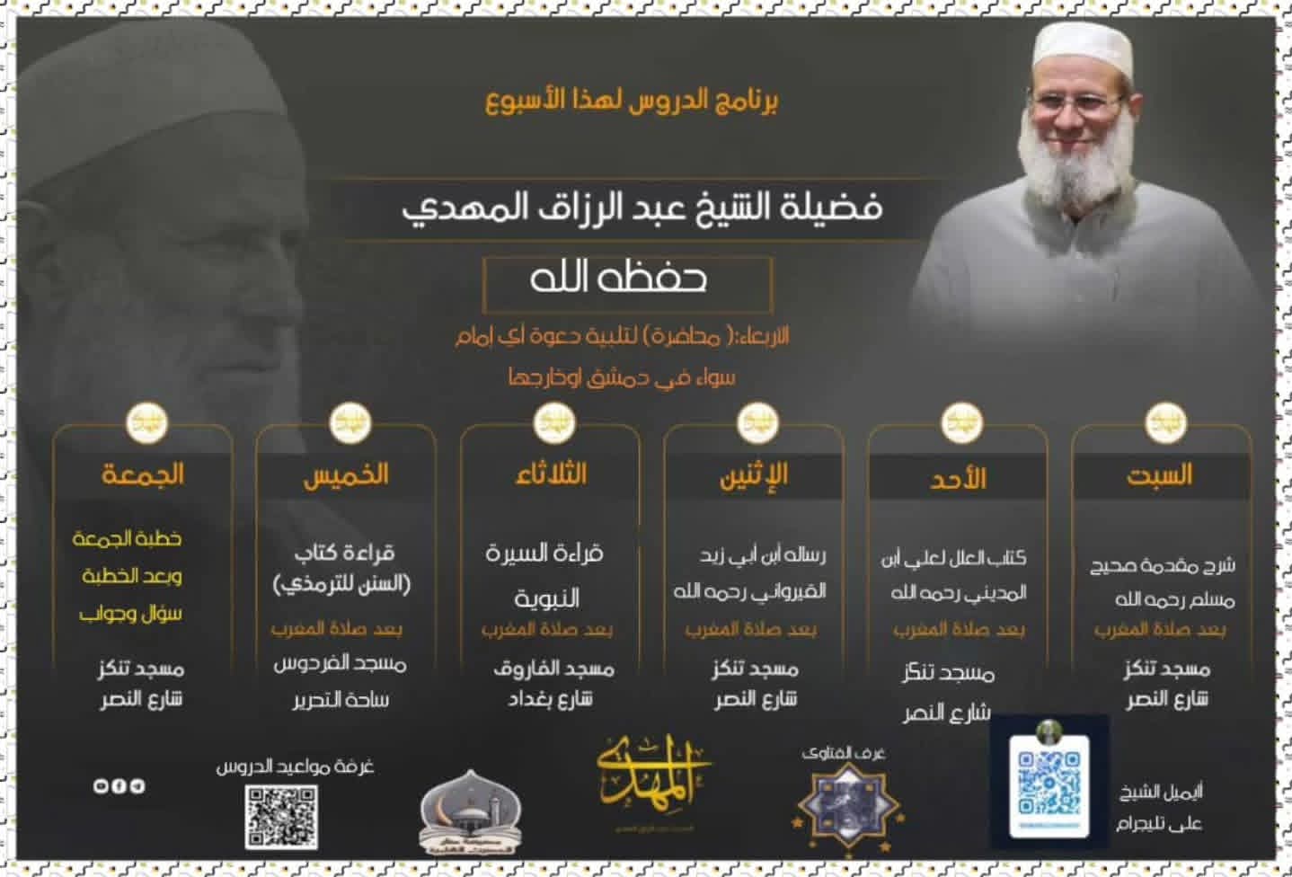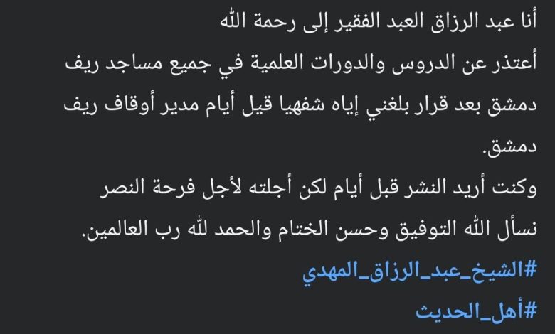 في خطوة أقرب الى عملية الإقصاء غير المباشر أعلن الشيخ عبد الرزاق المهدي، أحد أبرز رموز التيار السلفي في سوريا ومن مؤسسي “هيئة تحرير الشام” قبل انشقاقه عنها، عبر صفحته على “فيسبوك” أنه أُبلغ شفهياً من مديرية الأوقاف في ريف دمشق بقرار إيقافه عن تقديم الدروس والدورات الدينية. وأوضح أنه تلقى القرار قبل أيام، لكنه اختار تأجيل الإعلان عنه احتراماً لاحتفالات “يوم التحرير”.
