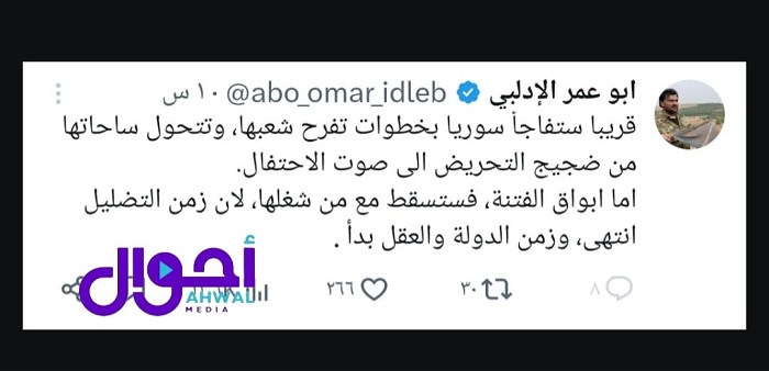 أكد الإدلبي في تدوينته أن سوريا على موعد قريب مع خطوات ملموسة ستغير المشهد العام، قائلاً: ”قريباً ستفاجأ سوريا بخطوات تفرح شعبها، وتتحول ساحاتها من ضجيج التحريض إلى صوت الاحتفال.”