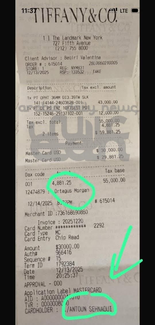 وتشير المعلومات المسربة إلى وجود وثائق تؤكد سداد فاتورة مشتريات بقيمة 55 ألف دولار أمريكي لصالح أورتاغوس، يُزعم أن مصدرها أموال تعود لمودعين لبنانيين عبر رجل الأعمال اللبناني وصاحب مصرف سوسيته جنرال انطون الصحناوي.