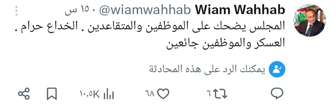 انتقد الوزير السابق وئام وهاب سياسة الـتأجيل والمماطلة تجاه حقوق الـعـسـكـريين والمـوظـفـيـن المتقاعدين، معتبراً في تغريدة له أن “ما يجري في المـجلـس (النيابي) هو ضحك على الأوجـاع.