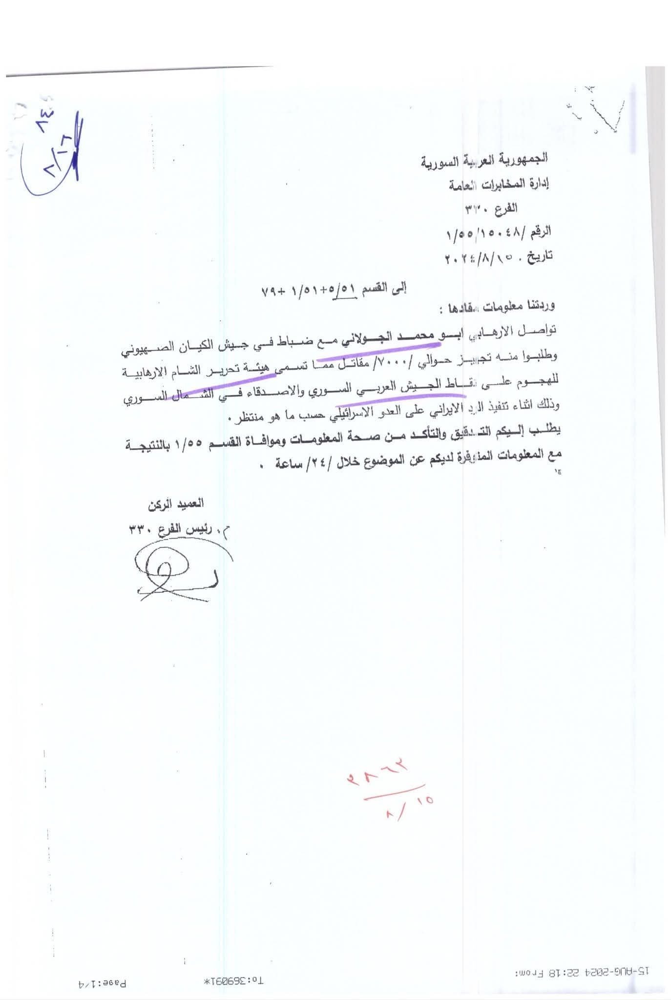 ​تكشف الوثيقة الصادرة عن إدارة المخابرات العامة عن وجود قنوات تواصل مباشر بين الجـولاني وضباط في الجيش الإسرائيلي.