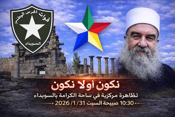 الدعوات التي أطلقها ناشطون في “اللوبي الدرزي الأمريكي” (IRF) لتنظيم مظاهرة مركزية حاشدة في ساحة الكرامة بمدينة السويداء، وذلك يوم السبت الموافق 31 كانون الثاني 2026 في تمام الساعة الحادية عشرة صباحاً.