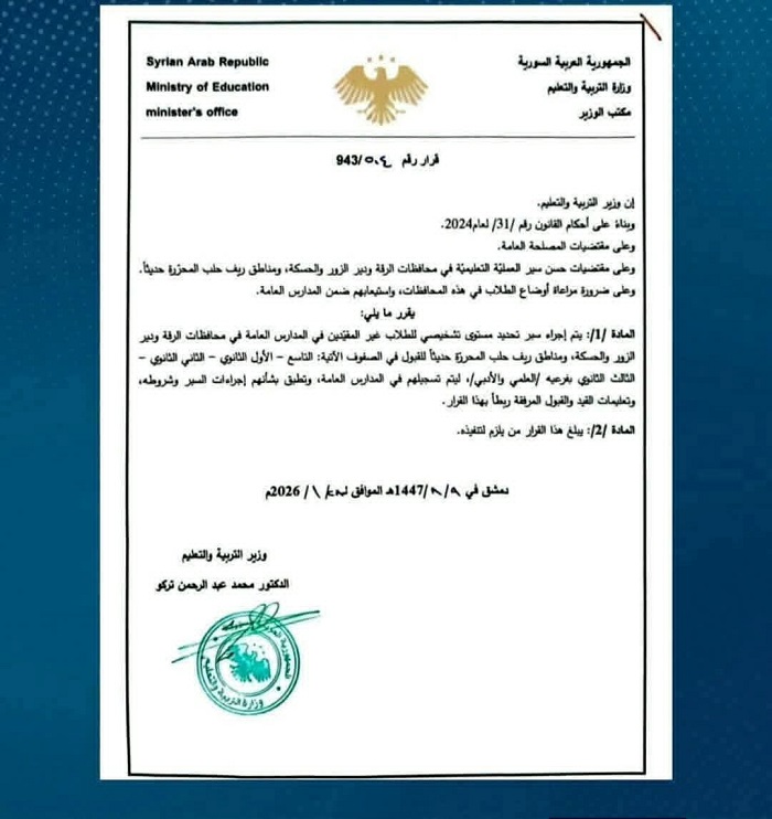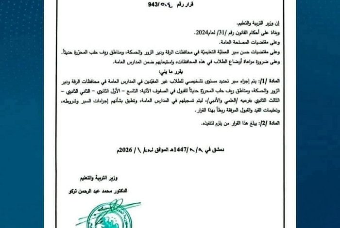 الوثيقة المتداولة، والمذيلة بتوقيع وزير التربية، تبيح إجراء “سبر معلومات” لطلاب في مناطق محددة (الرقة، دير الزور، الحسكة، وريف حلب) للدخول مباشرة إلى الصف الثالث الثانوي (البكالوريا) بفرعيها العلمي والأدبي، دون الحاجة لشهادة التعليم الأساسي (التاسع).