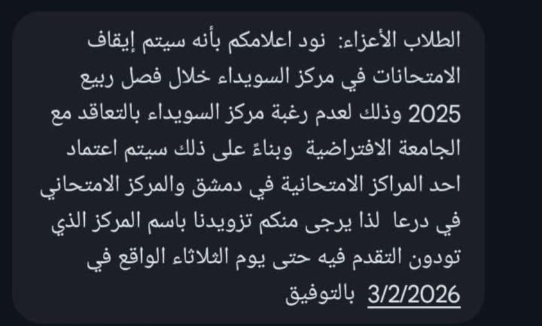 في خطوة أثارت موجة من الغضب والقلق، واجه آلاف الطلاب في محافظة السويداء قراراً مفاجئاً من إدارة الجامعة الافتراضية السورية يقضي بإيقاف الامتحانات في مركز نفاذ المحافظة. وبينما تذرعت الجامعة بأسباب إدارية تتعلق بـ “انتهاء مدة التعاقد”، تؤكد الوقائع على الأرض أننا أمام عملية “حصار تعليمي” متعمد يستهدف المكون الدرزي في ظل ظروف أمنية بالغة التعقيد واستكمال لسيناريو ما حدث مع الطلاب الدارسين في الجامعات الحكومية والخاصة وخارج المحافظة الذين حرموا من حقهم في التعليم .