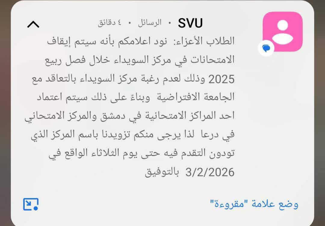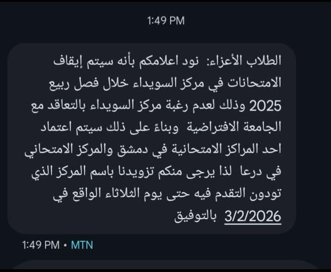 رغم الرسائل النصية التي وصلت للطلاب وتدعي أن “مركز السويداء هو من رفض التعاقد وغير جاهز ومؤمن، كشفت مصادر من داخل المركز عن جاهزيته التامة واستعداده اللوجستي والأمني لاستقبال الطلاب” .