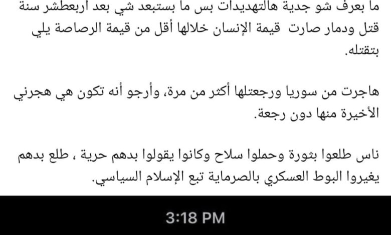 وفي شهادة تكشف الاستمرارية المأساوية، يعلّق أبو الشامات: “تغيير النظام لا يعني تغيير النهج… جمهور سلطة الجولاني تحول كله لشبيح”. ويُضيف بمرارة: “بعد 14 سنة دمار، صارت قيمة الإنسان أقل من قيمة الرصاصة”.