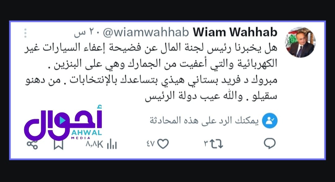 وطالب الوزير وئام وهاب رئيس لجنة المال والموازنة بكشف ملابسات إعفاء سيارات البنزين من الرسوم الجمركية بشكل غير قانوني، معتبراً أن هذا التجاوز يصب في خانة التوظيف الانتخابي لصالح النائب فريد البستاني، ووصف هذا الاستغلال لموارد الدولة بـ”المعيب” في ظل الأزمة الراهنة.
