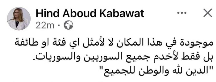 أثار تصريح الوزيرة في سلطة الجولاني، هند قبوات، عبر منصة إكس، عاصفة انتقادات بعد تأكيدها أنها “لا تمثل أي فئة أو طائفة بل تخدم جميع السوريين والسوريات”، وذلك عقب رفع صورها في عشرات الكنائس داخل سوريا واعتبار انها لا تمثل الطائفة المسيحية، وجاء منشور “الوزيرة قبوات” في وقت يتصاعد فيه القلق داخل الشارع المسيحي، وسط اضطراب أمني وعودة نشاط تنظيم داعش وتكرار حوادث طالت مسيحيين.