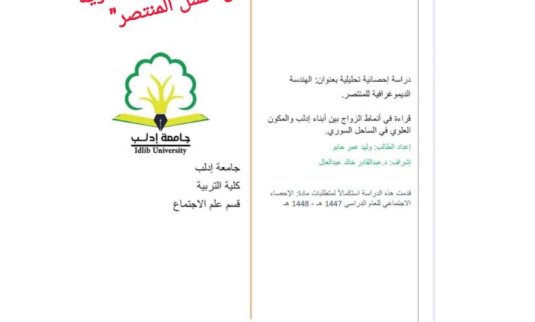 وبحسب النسخ المتداولة على منصات التواصل، يحمل البحث عنوان “الهندسة الديموغرافية للمنتصر”، وهو مشروع عملي في مادة الإحصاء الاجتماعي من إعداد الطالب وليد عمر حابو، بإشراف الدكتور عبد القادر عبد العال. وتتضمن الدراسة عبارات حرفية من قبيل “تدجين البيئة الاجتماعية للطائفة العلوية” وفرض “نسل المنتصر”، عبر تشجيع زواج أبناء إدلب من نساء علويات من عائلات عسكرية وأمنية، بهدف إنتاج “نسل ذي خلفية عسكرية يكون حارساً طبيعياً على مصالح إدلب في الساحل”، وفق ما ورد في النص المتداول.
