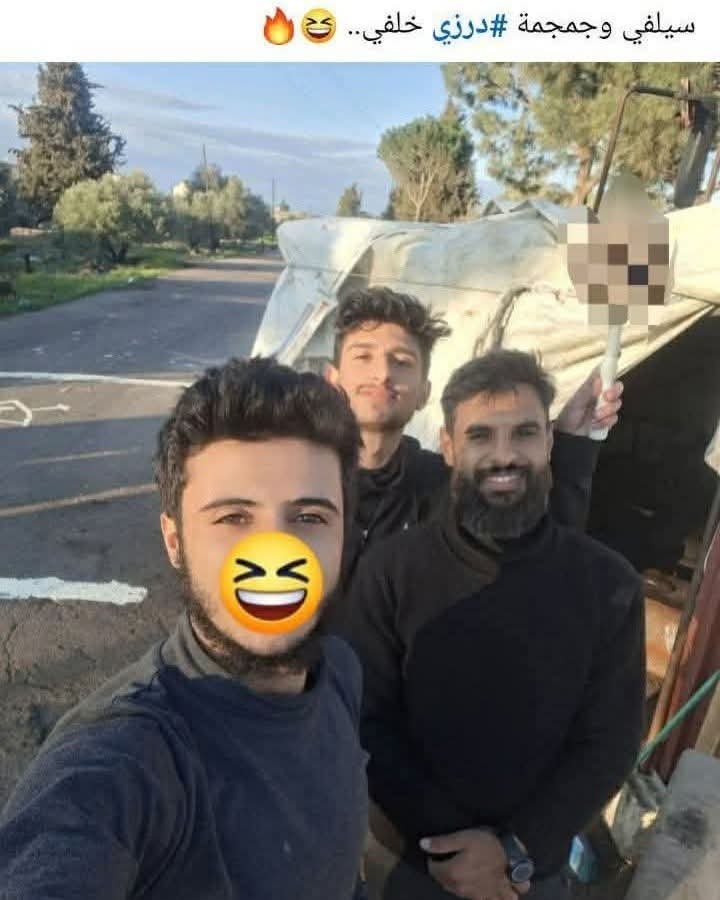 فقد تداول ناشطون صوراً نشرها أحد عناصر “الأمن العام” التابع لسلطة الجولاني، وهو يوثق لحظة تواجده هو وزملائه في قرية تعارة المحتلة. الصور التي تظهر على أنها غنائم حرب أو رموز نصر، حملت في طياتها دلالات عميقة على النظرة التي تحكم أداء هذه القوات تجاه أبناء الطائفة الدرزية. ظهر العنصر في إحدى الصور حاملاً بيديه جمجمة أحد شهداء الطائفة، متخذًا من بقايا الآدميين رمزًا للقوة والتفوق. وفي مشاهد أخرى تكشف مستوى متدنياً من الوعي والاحترام للمقدسات، ظهر العنصر وهو يدوس بعسكريته على عمامة شيخ درزي، كما رفع مقصًا في إشارة واضحة ومقصودة للإهانة والاستهداف الرمزي لشوارب شيوخ الطائفة، التي تمثل جزءًا من هويتهم ووقارهم.