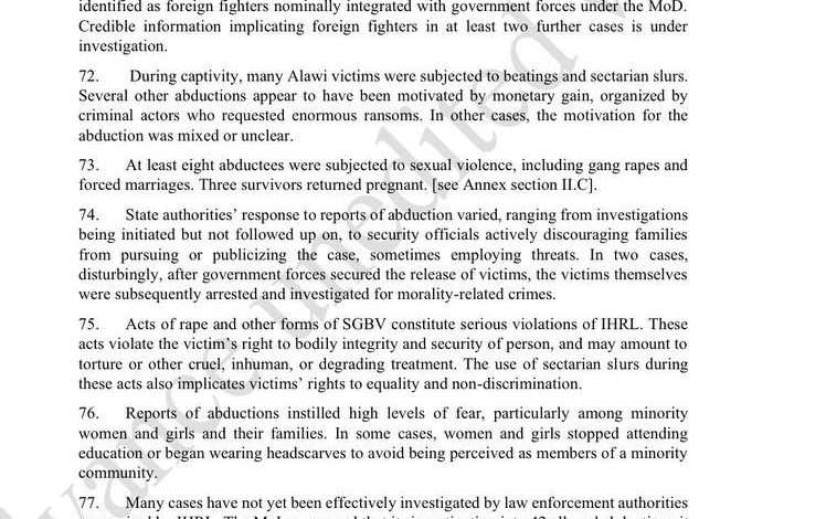 وفي ما يتعلق بأحداث الساحل، أكد التقرير أن القوات الحكومية وأفراداً يعملون إلى جانبها قتلوا أكثر من 1400 شخص، معظمهم من المدنيين العلويين، في اللاذقية وطرطوس وحمص وحماة. كما تلقت اللجنة عشرات البلاغات خلال عام 2025 عن اختطاف نساء وفتيات، خصوصاً من المجتمع العلوي.