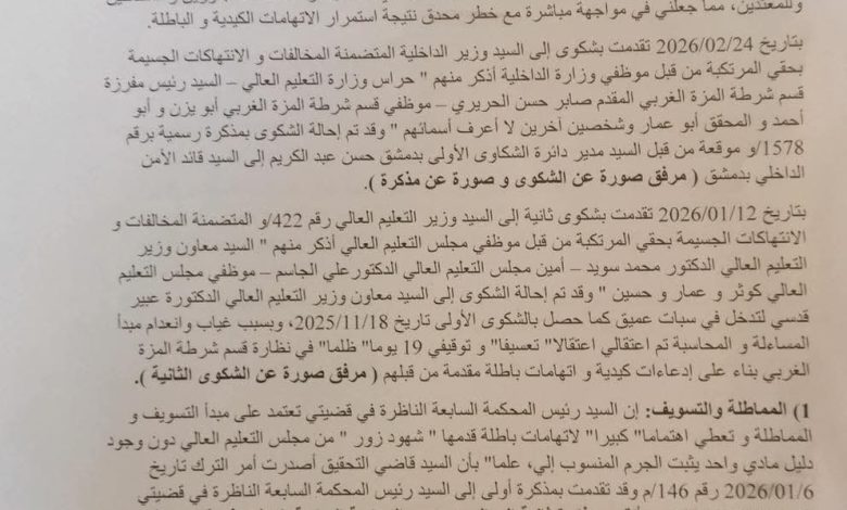 وبحسب الوثائق، أشار معاد إلى أن الشكاوى التي رفعها لاحقاً، سواء إلى وزارة التعليم العالي بتاريخ 12/01/2026 أو إلى وزارة الداخلية بتاريخ 24/02/2026، تم تحويلها إلى جهات معنية دون اتخاذ إجراءات فعلية، معتبراً أنها بقيت دون متابعة أو مساءلة.