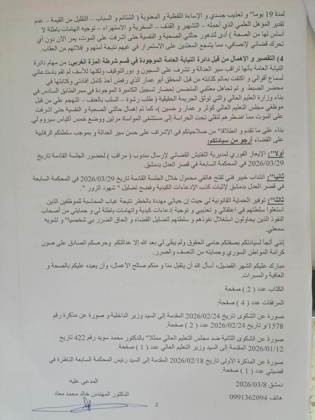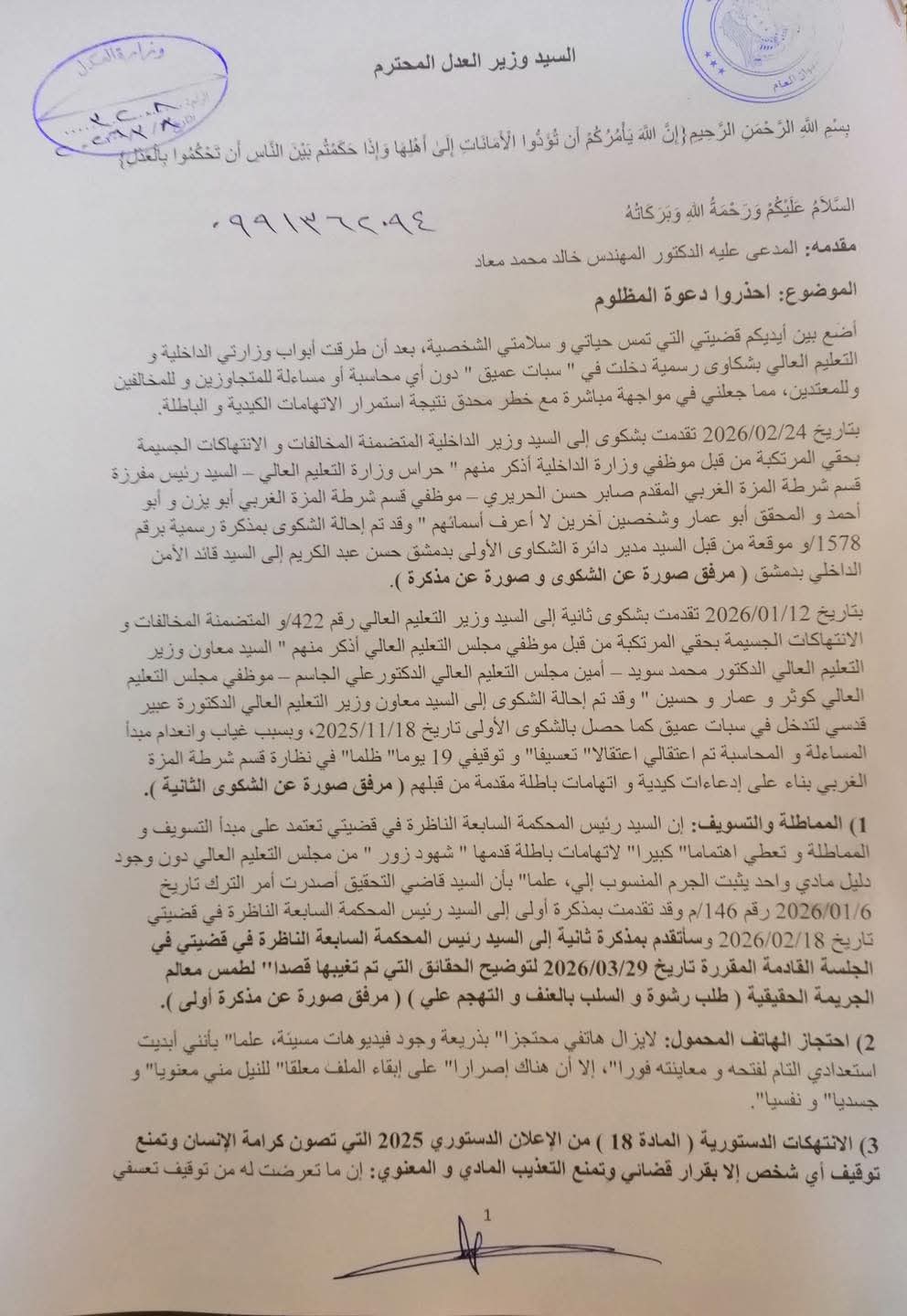 تقدّم الدكتور المهندس خالد محمد معاد بسلسلة شكاوى رسمية إلى وزارات التعليم العالي والداخلية والعدل، كشف فيها تعرضه للاعتقال التعسفي والتوقيف لمدة 19 يوماً داخل نظارة قسم شرطة المزة الغربي بتاريخ 18/12/2025، على خلفية اتهامات وصفها بالكيدية مقدّمة من موظفين في مجلس التعليم العالي، وذلك بعد شهر من تقدّمه بشكوى ضدهم بتاريخ 18/11/2025.