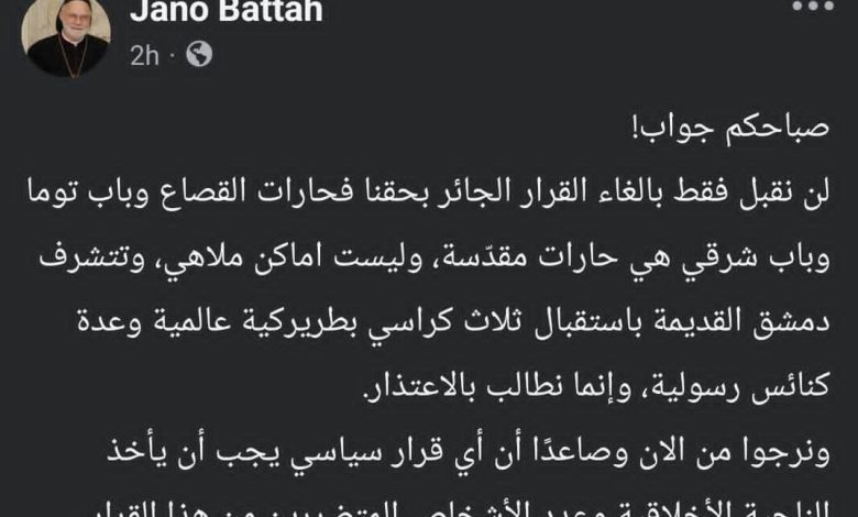 رداً على هذا التعدي، أعلن المطران مار يوحنا جهاد بطّاح، راعي أبرشية دمشق للسريان الكاثوليك، رفض الكنيسة القاطع لهذا “القرار الجائر”، مؤكداً أن هذه الأحياء الدمشقية هي حارات مقدسة تحتضن كراسي بطريركية عالمية وليست مجرد “أماكن للهو واحتساء الخمر” كما تصورها عقلية السلطة، مطالباً ليس فقط بإلغاء القرار بل باعتذار رسمي من الإدارة الحاكمة.