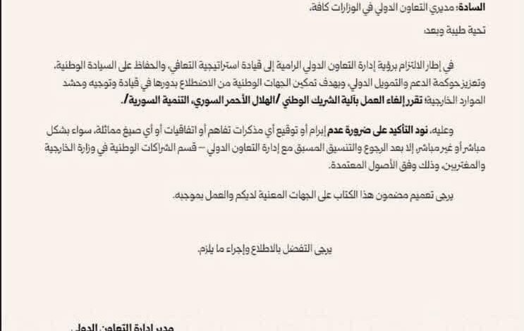 أصدرت وزارة الخارجية السورية في سلطة الجولاني قراراً يقضي بإلغاء تصنيف مؤسستي “الأمانة السورية للتنمية” و”الهلال الأحمر السوري” كشركاء وطنيين للحكومة، وهو ما يترتب عليه تجريد هذه المنظمات من صلاحية عقد اتفاقات مباشرة مع المانحين الدوليين أو المنظمات الخارجية دون الحصول على موافقة مسبقة وحصرية من الوزارة.