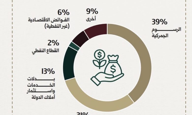 وتوضح الأرقام الواردة في الرسم البياني للوزارة أن الرسوم الجمركية تصدرت القائمة بنسبة 39%، تليها الضرائب والرسوم غير الجمركية بنسبة 31%، بينما لم تتجاوز مساهمة القطاع النفطي 2%، والفوائض الاقتصادية غير النفطية 6%، في حين شكلت بدلات الخدمات واستثمار أملاك الدولة 13%، و9% لإيرادات أخرى.