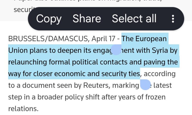وتكشف الوقائع التي اجتزأها الإعلام الرسمي لسلطة دمشق، أن الاتحاد الأوروبي بصدد فتح “حوار سياسي رفيع المستوى” (High-Level Political Dialogue) مع السلطات الانتقالية، لكنه وضع هذا الحوار تحت إطار رقابي صارم يرهن أي خطوة بمدى الالتزام الفعلي بمسار الانتقال السياسي.