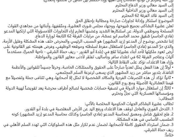 وطالبت القبيلة سلطة الأمر الواقع في دمشق برفع اليد فوراً عن الأرض المغتصبة ومحاسبة “فادي الجاسم” و”زيد المشهور”، محملة قادة “الفرقة 62” المسؤولية الكاملة عن زعزعة السلم الأهلي في المنطقة.
