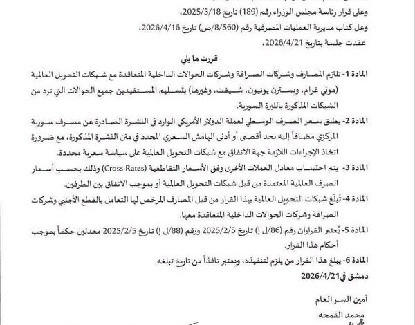 ​ونص القرار الصادر بتاريخ 21 نيسان 2026، على تطبيق سعر الصرف الوسطي لعملة الدولار الأمريكي الوارد في نشرة المصرف المركزي، مع إلزام شبكات التحويل العالمية بالسياسة السعرية المحددة من قبله.