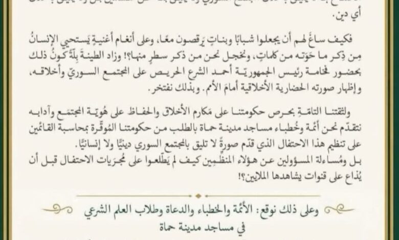 تتجلى هذه الازدواجية بوضوح في واقعة “صالة الفيحاء” بدمشق ، حيث خرج العشرات من الأئمة بحماة (الموالين للسلطة) في بيان غاضب يستنكر “الرقص والاختلاط” في حفل افتتاح الصالة، متجاهلين أن رأس السلطة نفسه كان حاضراً ومشاركاً في الفعالية!