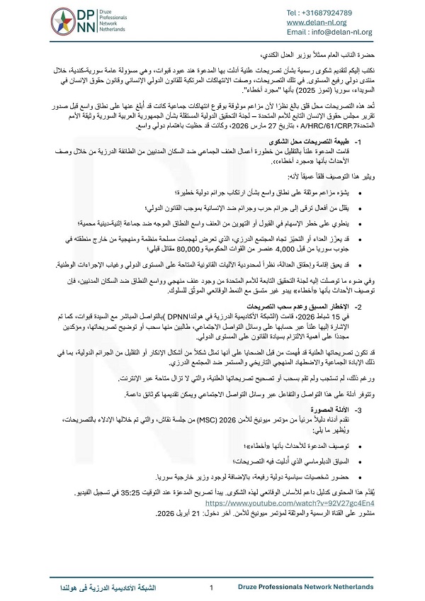 وكشفت وثائق رسمية عن قيام الشبكة الأكاديمية الدرزية في هولندا (DPNN) بتقديم ادعاء قانوني لدى النائب العام ووزير العدل الكندي ضد قبوات، التي تحمل الجنسية الكندية إلى جانب السورية، على خلفية تصريحات أدلت بها في “منتدى ميونيخ للأمن 2026”. وصفت قبوات في تلك التصريحات الانتهاكات المروعة التي تعرض لها المدنيون في مدينة السويداء خلال تموز 2025 بأنها “مجرد أخطاء”، في محاولة لشرعنة العنف الممنهج الذي مارسته القوات التابعة لسلطة الجولاني.