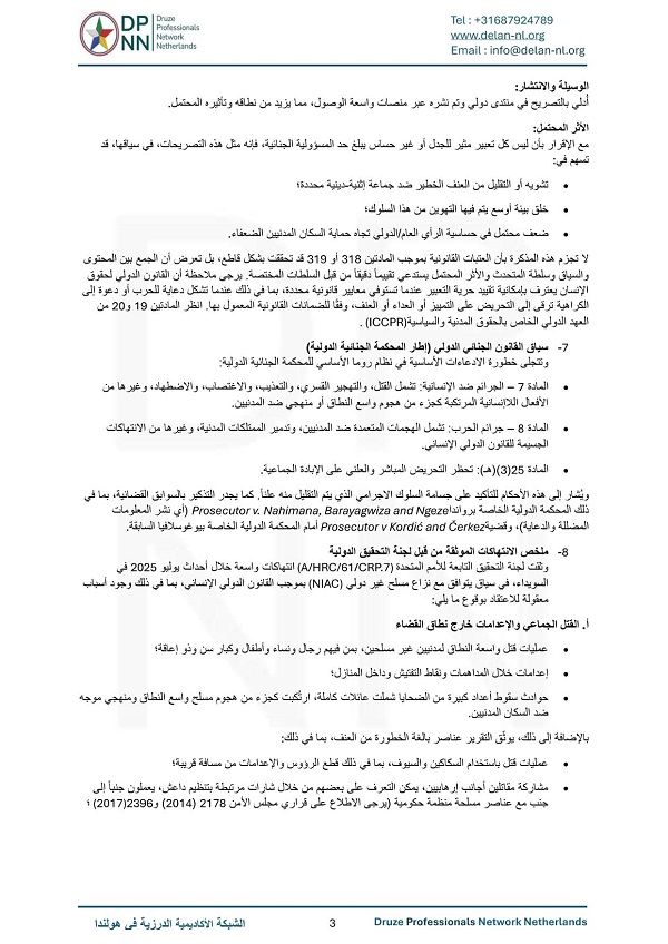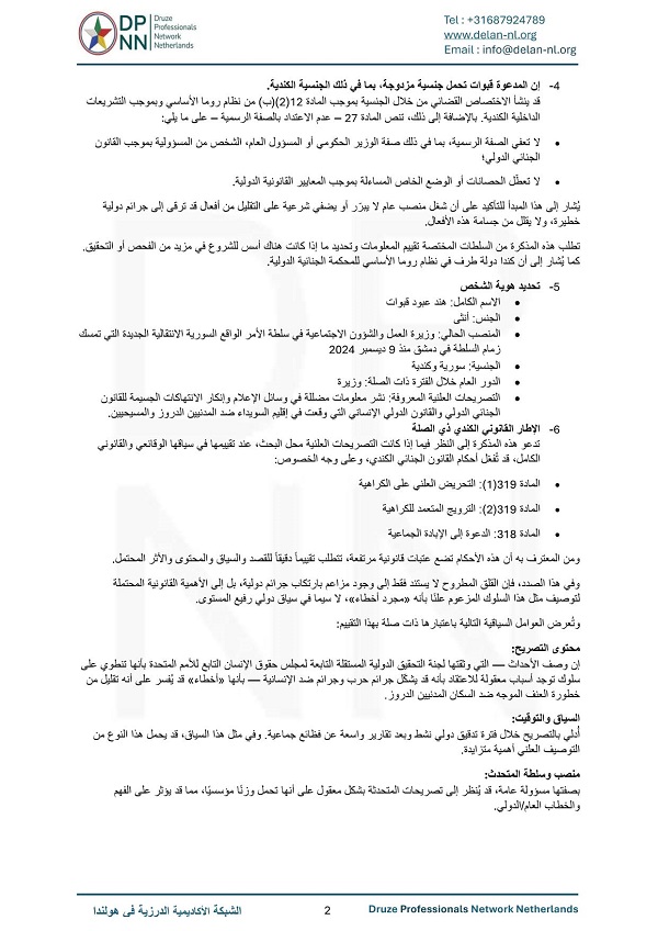 وتستند الدعوى القضائية إلى تقارير أممية موثقة (UN Doc A/HRC/61/CRP.7) تؤكد وقوع إعدامات ميدانية وعمليات قتل جماعي بالسكاكين والسيوف، شارك فيها آلاف المقاتلين وعناصر إرهابية تحمل شارات تنظيم “داعش” تحت مظلة سلطة دمشق الحالية. ويؤكد الإخطار القانوني أن توصيف هذه الفظائع كـ “أخطاء” من قبل مسؤولة عامة لا يشكل تضليلاً إعلامياً فحسب، بل يندرج ضمن المواد (318) و(319) من القانون الجنائي الكندي المتعلقة بالدعوة للإبادة الجماعية والترويج المتعمد للكراهية ضد جماعة إثنية ودينية محمية.
