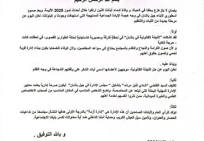 أعلن الشيخ الرئيس الروحي للموحدين الدروز في السويداء الشيخ حكمت الهجري عن بدء مرحلة جديدة من التنظيم الإداري في محافظة السويداء ، تمثلت بتكليف القاضي “شادي فايز مرشد” بتشكيل “مجلس الإدارة في السويداء”. وتأتي هذه الخطوة، وفقاً للبيان الرسمي الصادر عن الرئاسة الروحية بتاريخ 7 نيسان 2026، كاستجابة مهنية تهدف إلى إدارة الأزمة الراهنة بعيداً عن المحاصصة، واعتماد معايير الاختصاص…