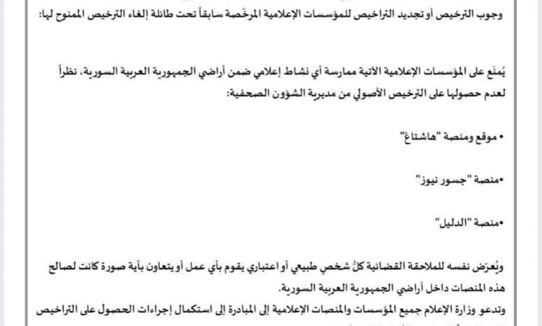 أصدرت وزارة الإعلام التابعة لسلطة الجولاني تعميماً يقضي بمنع عمل ثلاث منصات إعلامية بارزة هي “جسور نيوز”، “هاشتاغ سوريا”، و”الدليل”، مهددةً بملاحقة كوادرها قانونياً في حال استمرار نشاطهم داخل البلاد بحجة “عدم الترخيص”. ويأتي هذا القرار في وقت تتبنى فيه الماكينة الإعلامية الرسمية رواية السلطة الحاكمة حصراً، بينما عُرفت المنصات المستهدفة بمحاولاتها تقديم محتوى يتسم بالحيادية، ما يضع هذا الإجراء…