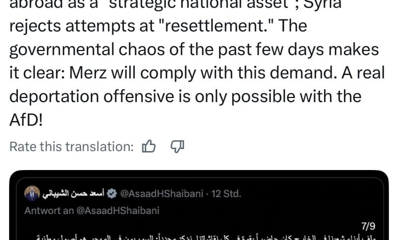 تسبّب منشور لوزير الخارجية في سلطة الأمر الواقع ، أسعد الشيباني، بموجة سخط واسعة لدى الرأي العام الألماني، مفجراً مواجهة سياسية حادة مع حزب “البديل من أجل ألمانيا” (AfD). جاءت هذه الأزمة عقب تصريحات للشيباني وصف فيها السوريين في الخارج بأنهم “أصول وطنية استراتيجية” وليست “أعباء”، معلناً رفض سلطته القاطع لأي مساعٍ تهدف إلى الترحيل القسري، وهو ما اعتبره اليمين…